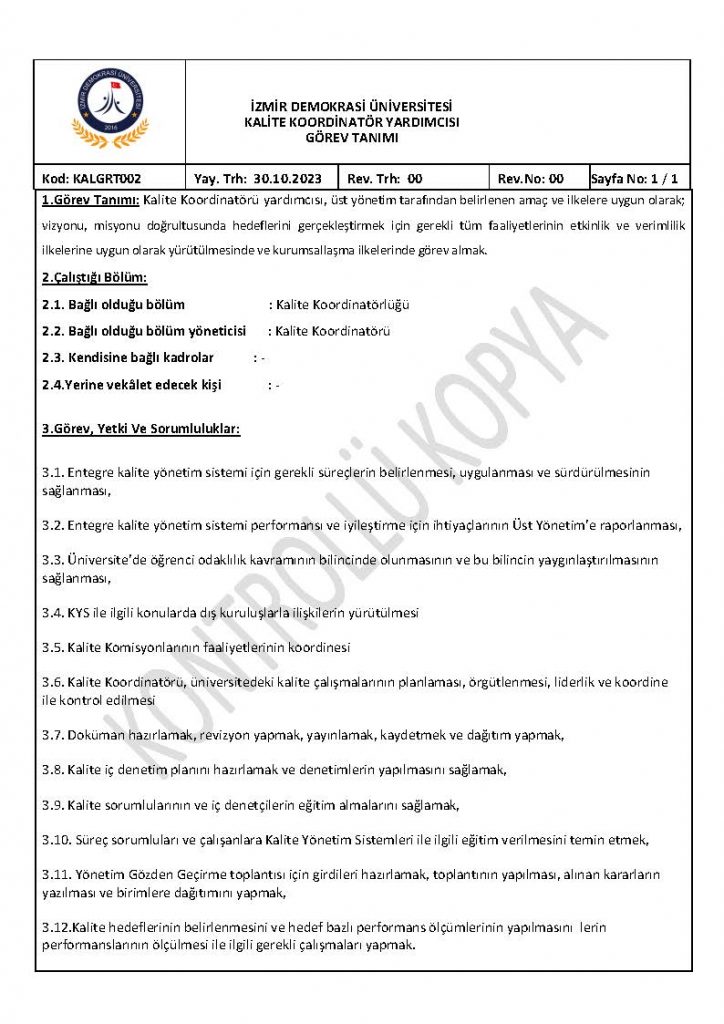 Kalite Koordinatör Yardımcısı Görev Tanımı